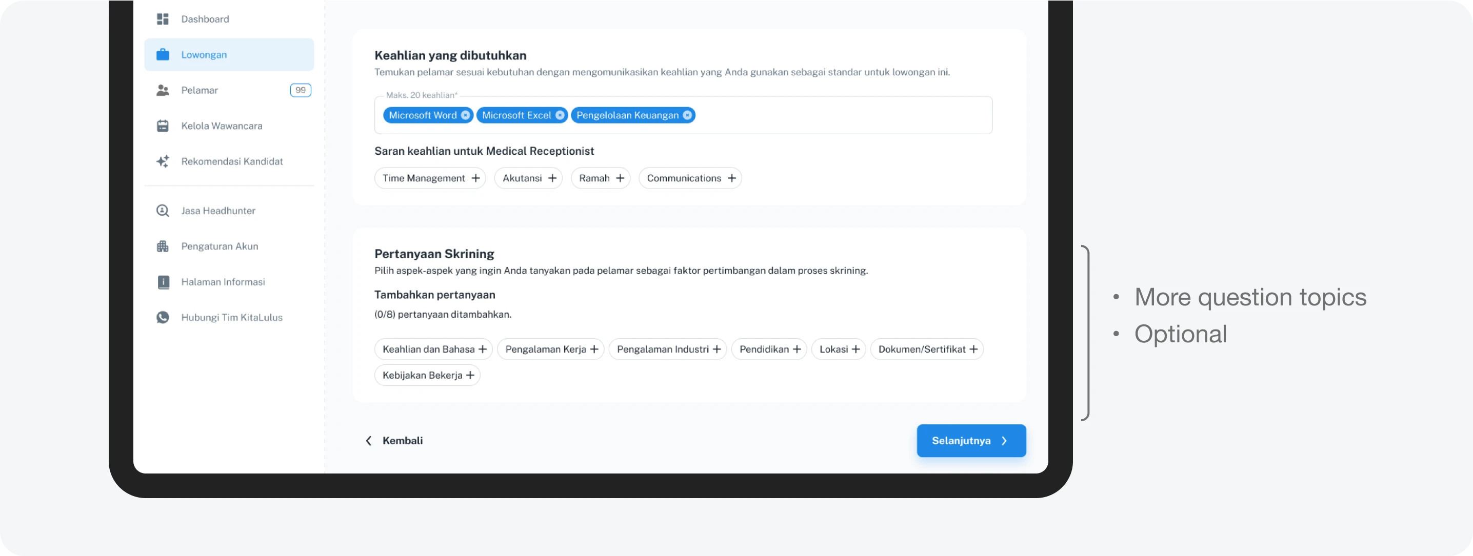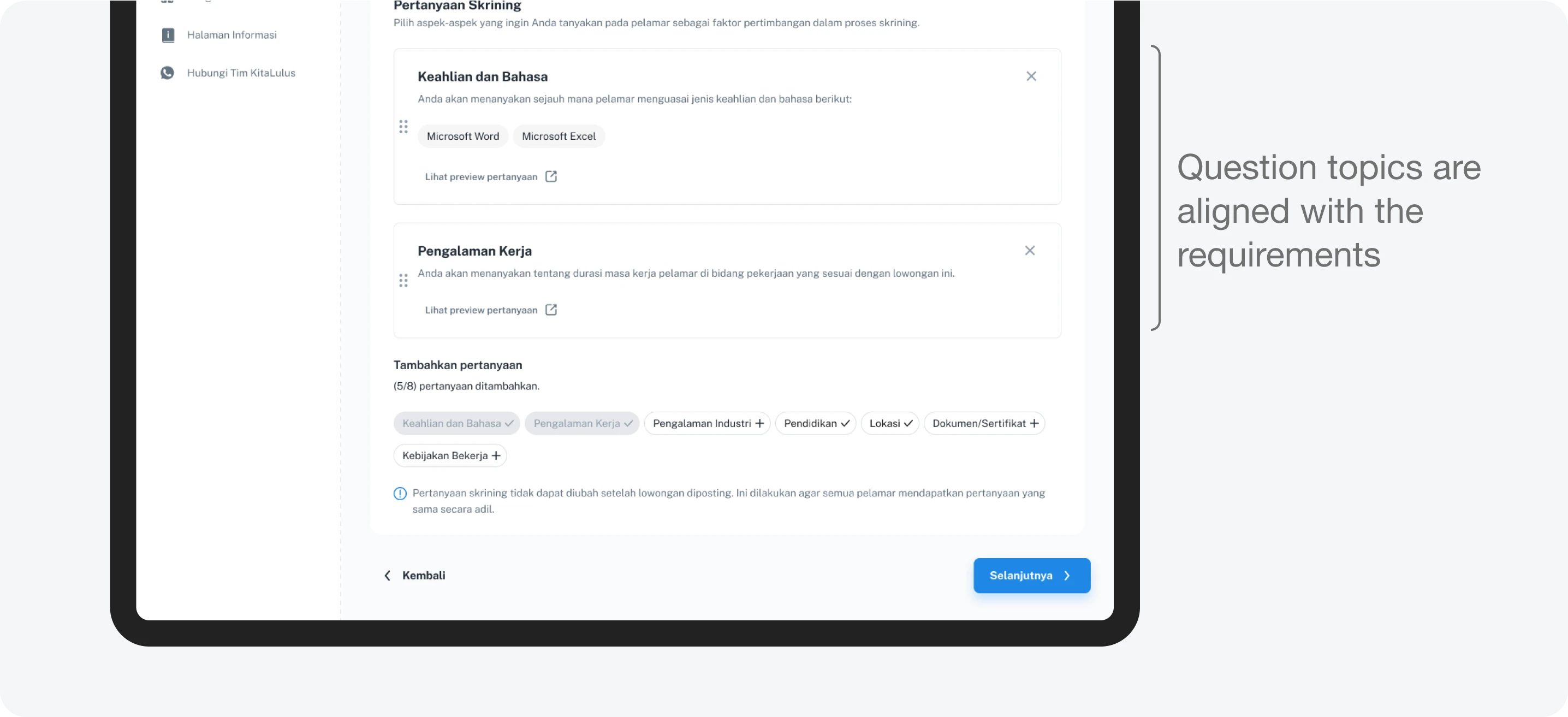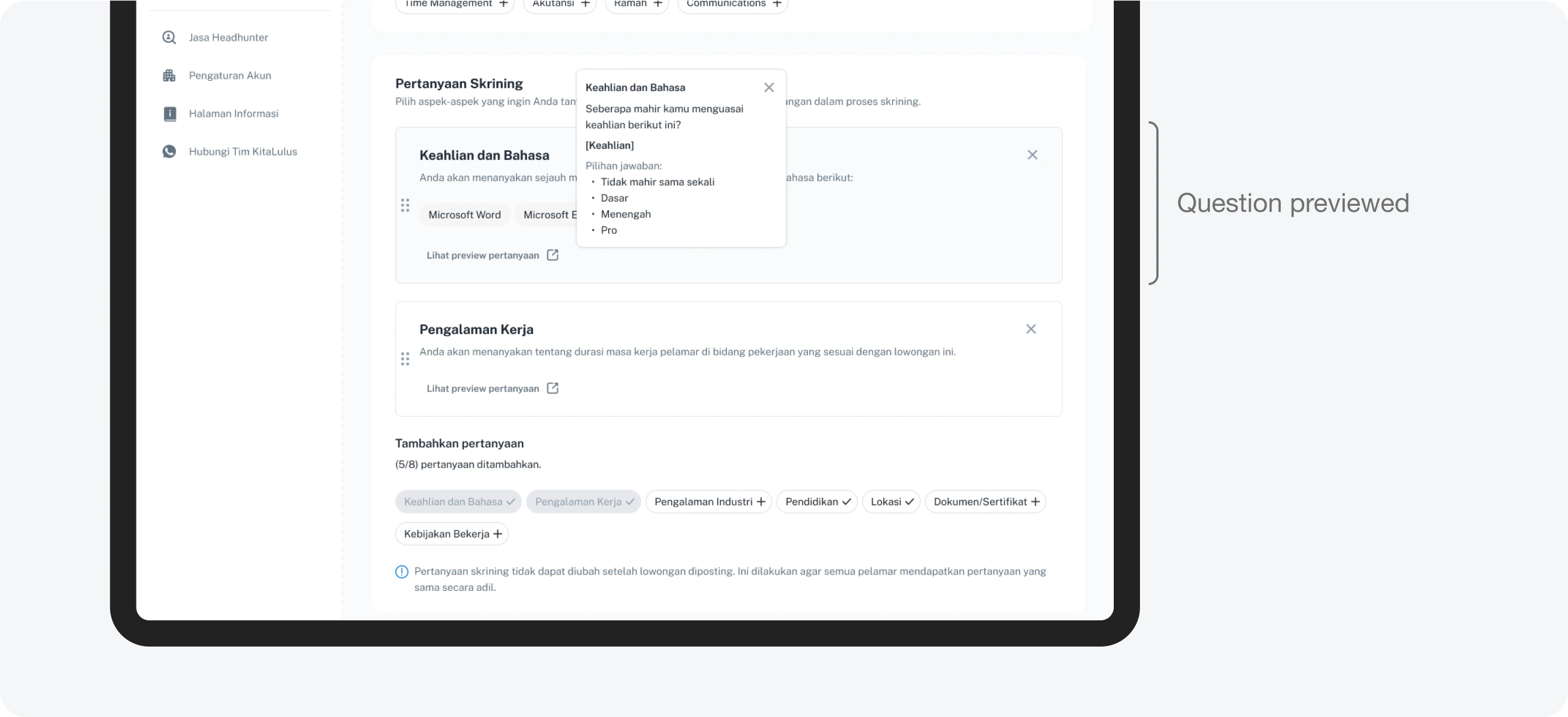 The root problem begins here, where there is no clear correlation between the job role or requirements and the screening questions. As a result, users may add questions that are not aligned with the actual needs of the job vacancy.